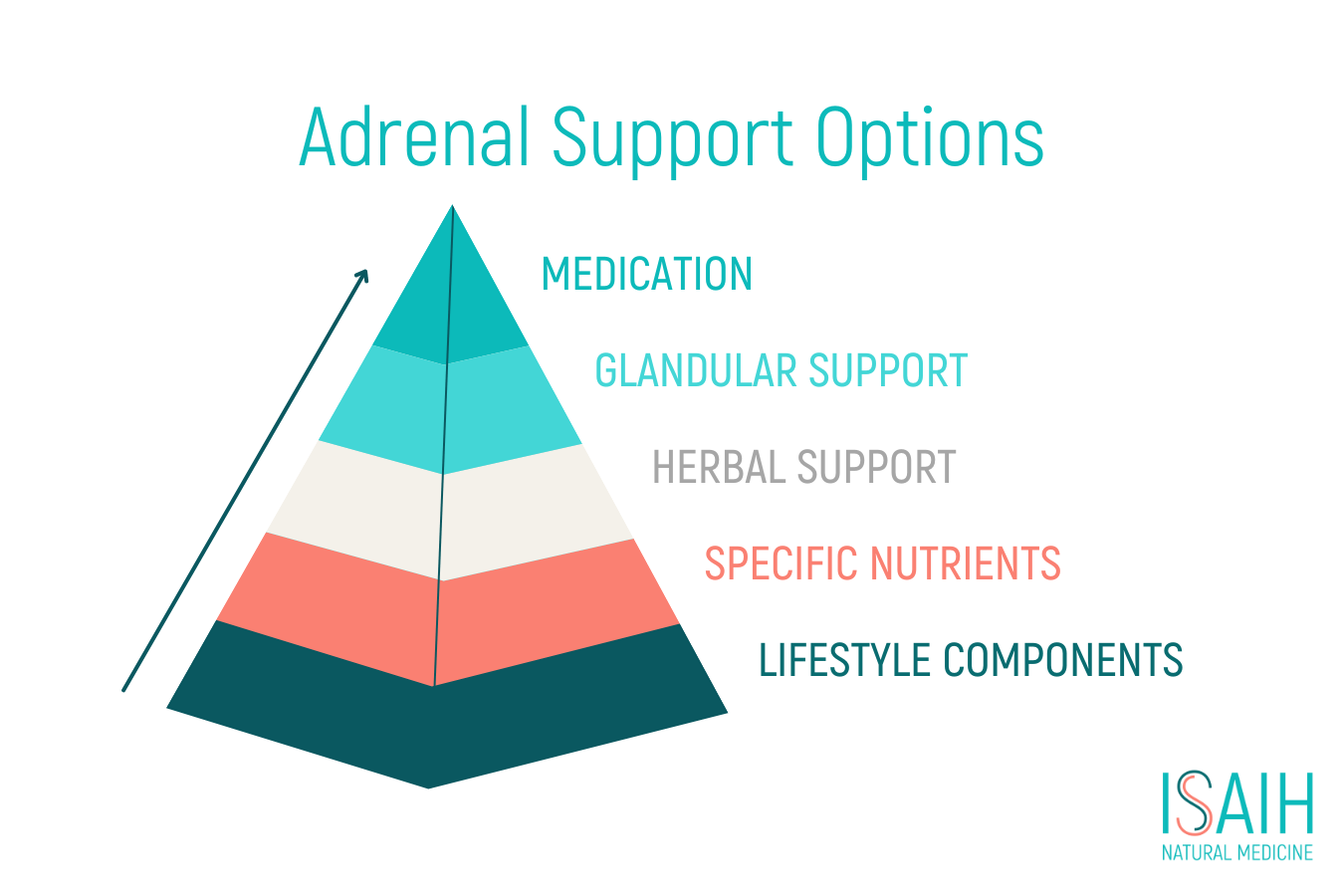 Building a sturdy foundation for adrenal health involves a multi-faceted approach! Picture adrenal support as a pyramid; At the base, we want to focus on lifestyle components. These truly shape the foundation of your adrenal and overall health! From there, we can add supporting factors like specific nutrients and supplements, and if medications are absolutely needed, we can utilize them to fortify your pyramid of adrenal support.