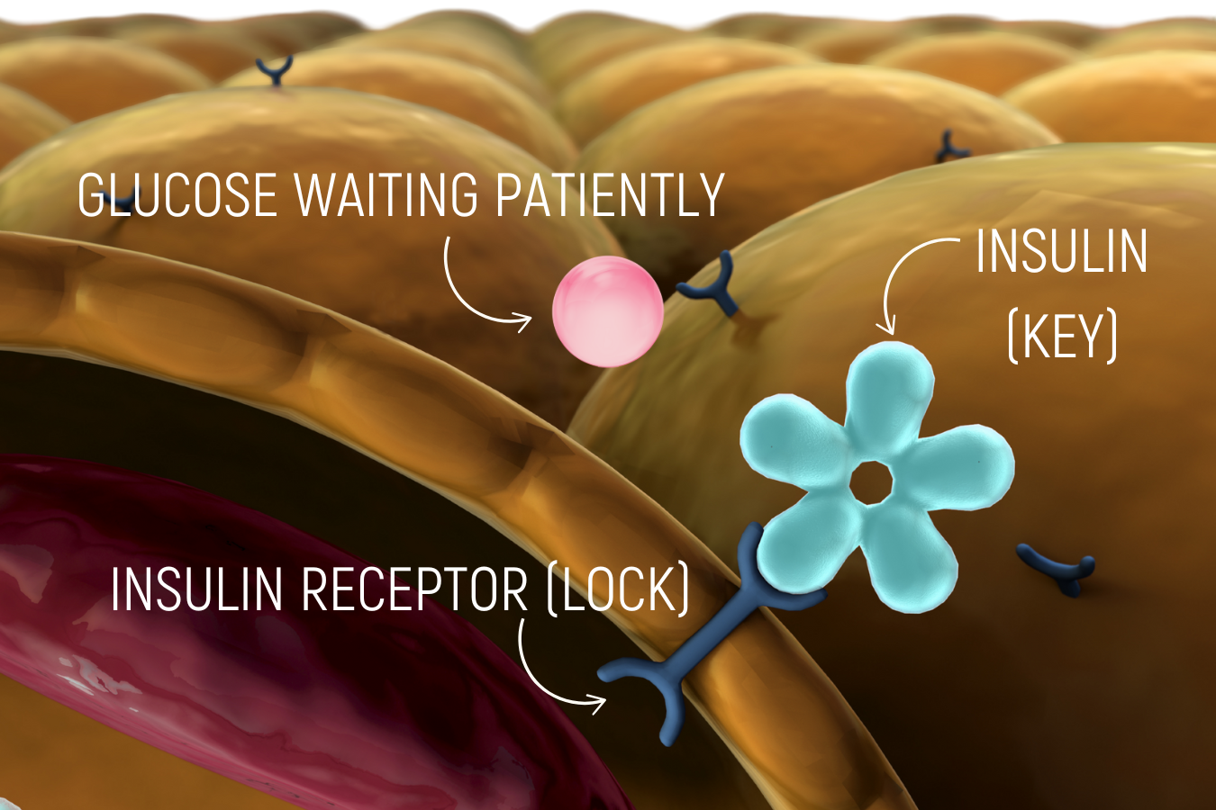When this goes awry, we have too much glucose too frequently so our cells start to think insulin sitting in the lock is just bluffing and we get less and less response. Our body can detect that glucose levels are not lower in the bloodstream so our intelligent cute bodies release more insulin which then goes and sits on those receptors on the cells. This means that beautiful lock and key mechanism breaks down and we then walk our way into insulin resistance. In a nutshell, our cells think we are bluffing and we require many locks to be filled, a secret password and a top secret handshake before we open the door to the cell to allow glucose inside.